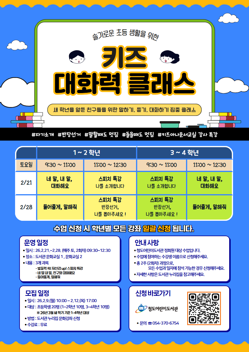 청도어린이도서관에서 새 학년, 새 학기를 맞아 말하기, 듣기, 대화하기 특별 강좌를 운영합니다.