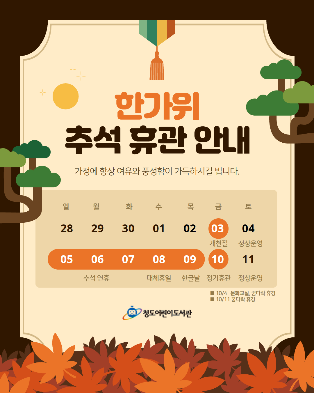 - (행사수정) [9월 13일] 북크닉 야외도서관 <에코 파크 북> 운영! 올 가을, 도서관이 공원으로 나왔다?!책으로 즐기는 피크닉먹고! 읽고! 놀고! 즐기자!잔디밭 위에 돗자리 깔고~ 편하게 쉬다가,책도 보고, 공연도 보고, 체험도 쏙쏙!2025 청도어린이도서관 야외도서관 에코파크북실내체육관9월 13일 토요일 오전 10시 ~ 오후 4시어른 아이 누구나상시 프로그램피크닉 용품·보드게임 대여 원데이클래스 (모루인형·포일아트 등 체험 6종)에어바운스·미니 놀이터특별 프로그램10:30~11:10 필라테스 13:30책 보물찾기 14:00 버스킹 공연 15:00 DoDream 타악기 체험가을의 시작, 책과 함께하는 힐링 타임!어린이도서관과 함께 즐겨요